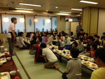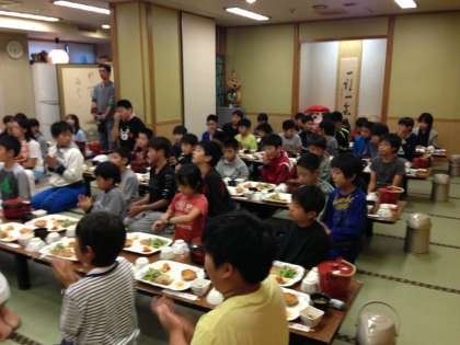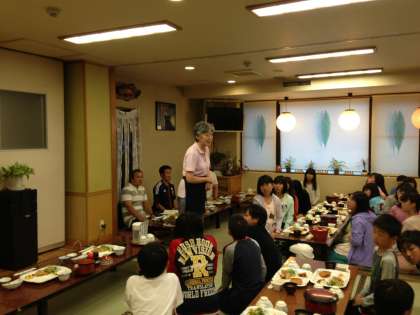 今から夕食です。ハイキングの疲れも吹き飛び、美味しそうな食事が目の前です。女将さんからのお話を聞いていただきます。日光最後の夕食です。