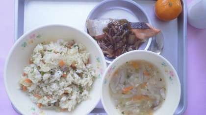 9月14日(木)カレーピラフ、鮭のきのこソース、ジュリエンヌスープ、くだもの(冷凍みかん)、牛乳