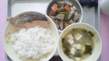 9月19日ごはん、鮭の塩焼き、いりどり、味噌汁、くだもの(巨峰)、牛乳