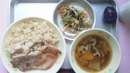 9月20日(水)里芋ごはん、豚肉の照り焼き、根菜汁、小松菜と揚げの煮びたし、くだもの(サンプルーン)、牛乳