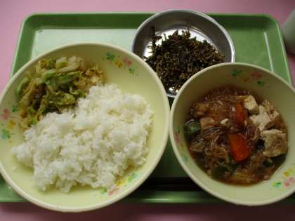5月14日(火)ごはん、肉豆腐、茎わかめのじゃこ炒め、香りキャベツ、牛乳