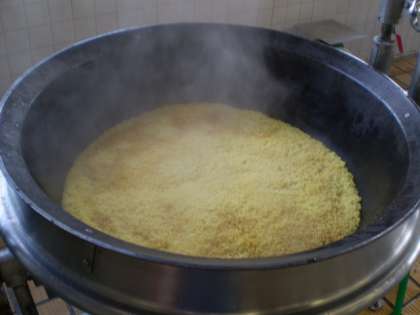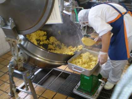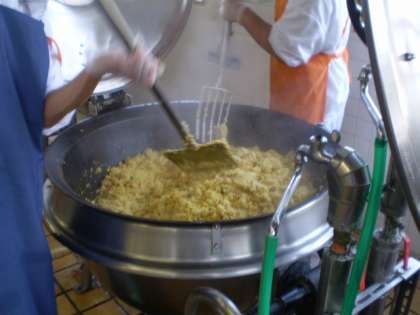 サフランライスを炊きます。具と混ぜ合わせます。これがすごい重労働で、二人で力を合わせて混ぜます。室内の温度も高いので大変ですね。