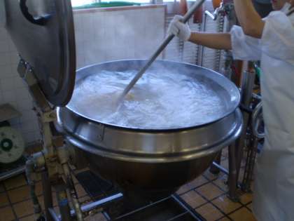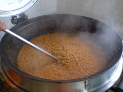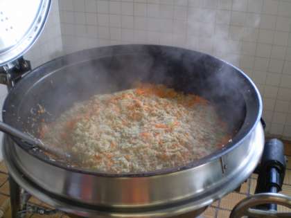 肉、玉ねぎ、人参とソースの具を炒めます。麺もすごい量です。今日は給食室内の温度が35度以上になっていたそうです。毎日毎日、大変ですね。