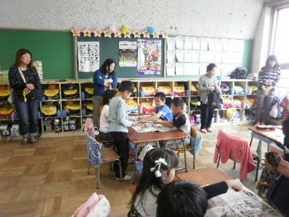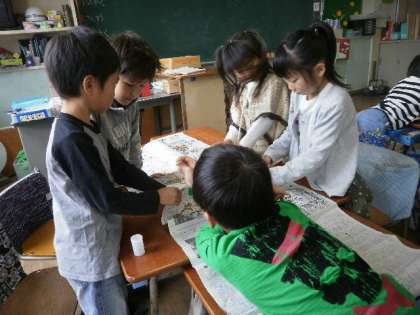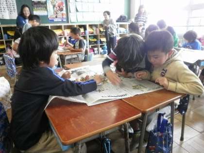 1年2組の様子です。春から育てた「ひまわり」の種をみんなで数えています。