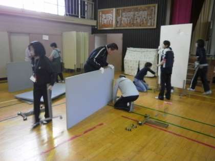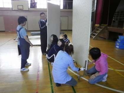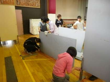 掲示板も組み立てます。校長先生も入って、みんなで力を合わせて組み立てています。