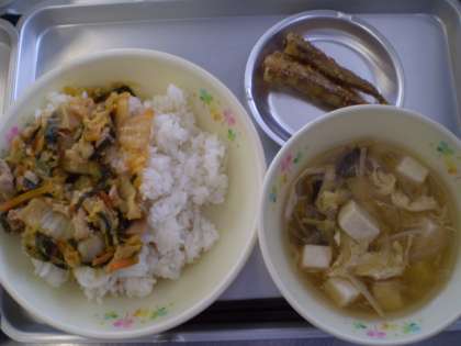 豚キムチ丼 ニギスの南蛮揚げ 豆腐のスープ