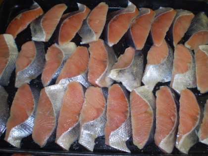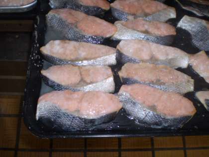 鮭はオーブンに並べて焼きます。焼く前はかなり大きな鮭もずいぶんと縮みますね。