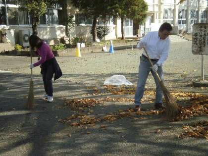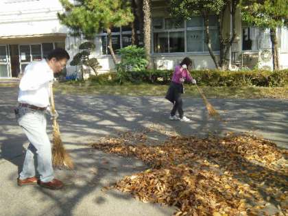 各コースから、皆さんがゴミ拾いしてくる間に、校庭では校長先生、生活指導主任の先生が落ち葉掃きをしています。
