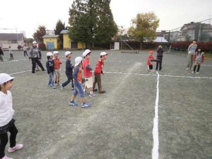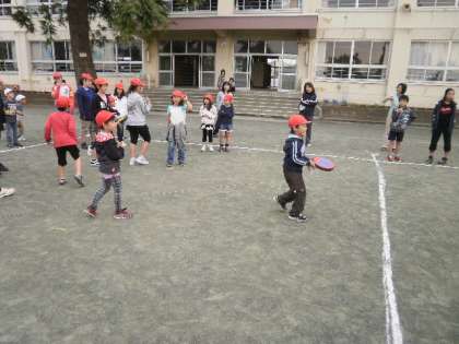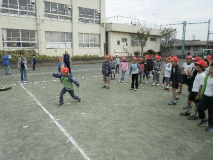 15日、集会の時間に兄弟学級で「ドッジビー」をしました。1年生と6年生、2年生と4年生、3年生と5年生が兄弟学級です。学年が混じって、赤白対抗で行いました。6年生が1年生に投げさせてあげようと気遣う姿。反対に3年生と5年生は本気で白熱した戦いを繰り広げていました。