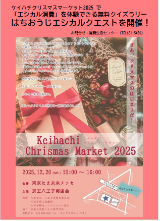 人や社会、環境に配慮した消費行動であるエシカル消費を体験できる無料クイズラリー「はちおうじエシカルクエスト」を、12月20日(土)東京たま未来メッセで開催のケイハチクリスマスマーケット2025でおこないます。マーケット全体では、5つのエリアに100以上のブースが集まる多摩地域最大級のクリスマスマーケットです。ぜひお越しください。