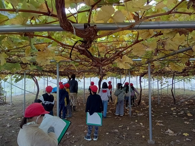 シャインマスカットのビニールハウスで作業の方法とかを教えてもらいました。シャインマスカットなどのブドウはとても雨に弱いそうです。