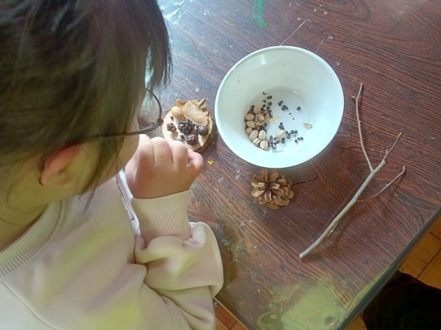 自分で選んだ材料を、グルーガンで接着して作品を作りました。