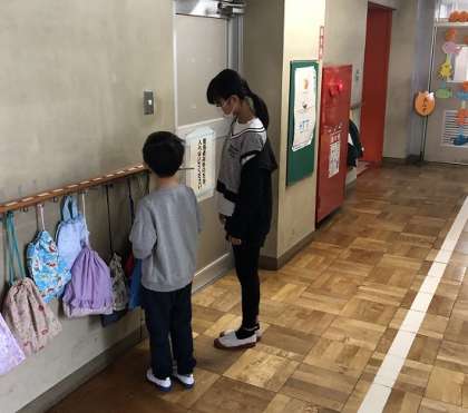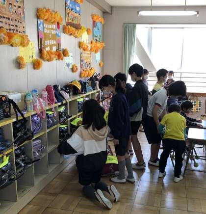 毎朝、6年生が1年生の教室や靴箱に出向き、登校してきた1年生のお世話をしてくれています。どんな声をかければよいのやら、とまどっている様子の6年生もいますが、みんなやさしい目をしています。