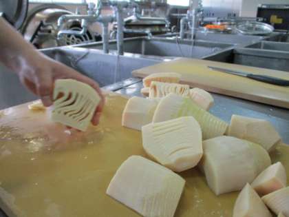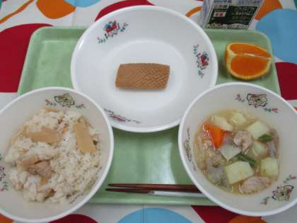 「今日は旬の食材【たけのこ】を使ってたけのこご飯を作りました。たけのこは成長が早く2週間もすると竹の子供も立派な竹に成長してしまいますので収穫時期もとても短いです。」
