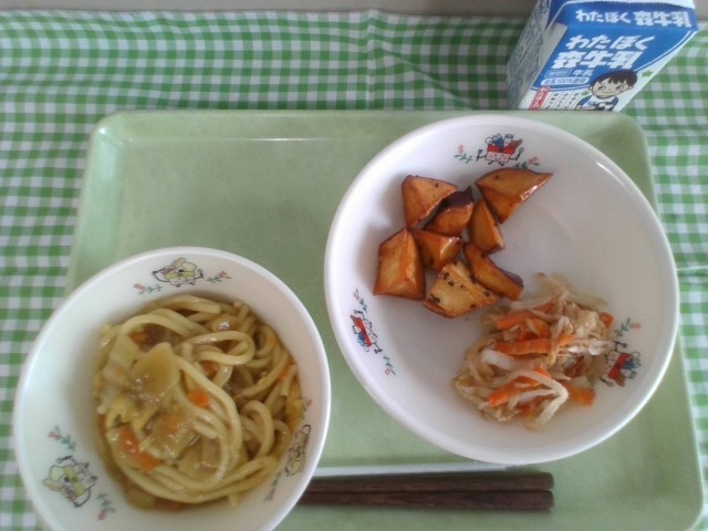 【献立】 ☆カレー南蛮 ☆切干大根のサラダ ☆大学芋 ☆牛乳  【主な食材の...