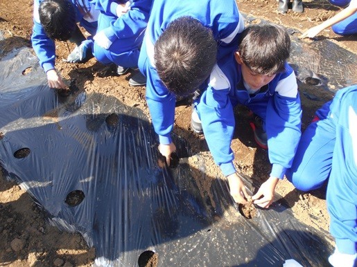 畑を耕したり、畝をつくったり、マルチシートを張るのは、1年生の教員で行いました。