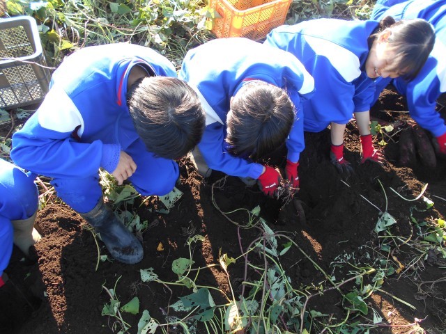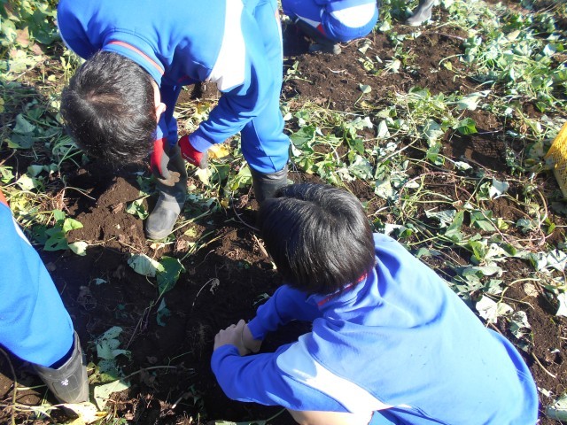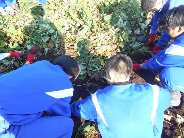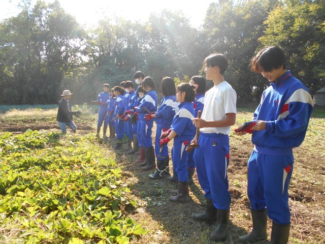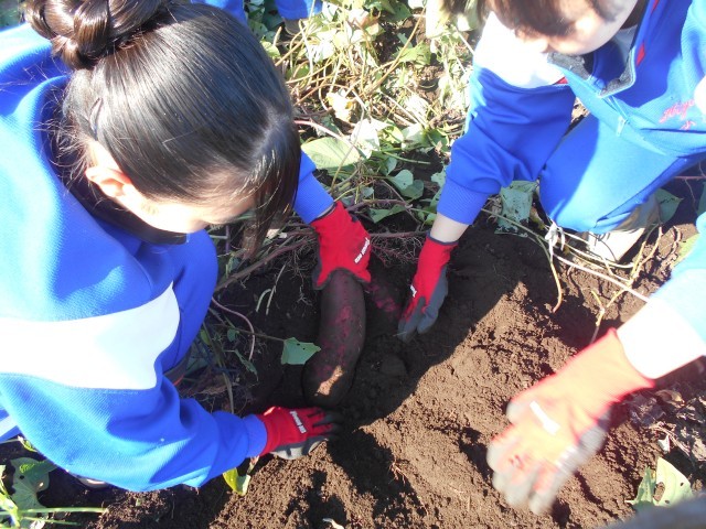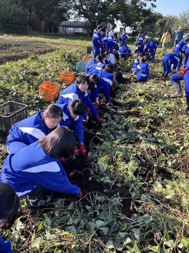 本日5,6校時で農業体験を行いました。地域の農場に行き、サツマイモの収穫を手伝いました。大きなサツマイモをたくさん掘り出し、約350gもの量を収穫しました。