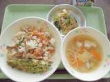 ちらしずし・笹かまぼこの翡翠(ひすい)焼き・七夕汁・野菜の煮びたし・牛乳