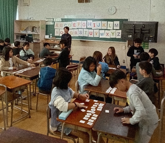 1年生のどんじゃんけんです。皆様もやったことありますか。とてもたのしそうでした。3年生の外国語活動。アルファベットに親しめるようカードで遊びました。最後に葉っぱのフレディです。今日の読み聞かせで使いました。心に響くお話ありがとうございました。