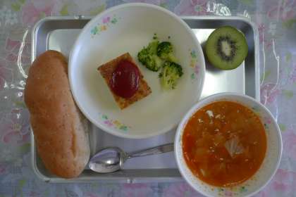 計画停電の影響により先週発注したパンを取り消すことができないため、主食をパンにした献立に変更しました。