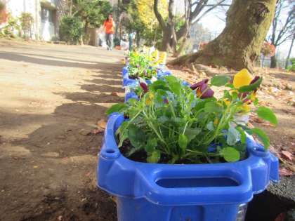 園芸ボランティアの方にもお手伝いいただいて、パンジーの苗と、チューリップの球根も植えました。