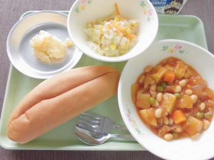 カスタードサンド・チキンビーンズ・フレンチサラダ・牛乳
