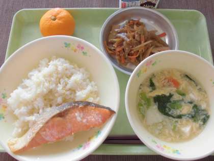 きびごはん・焼き魚(鮭)・かきたま汁・五目きんぴら・果物(みかん)・牛乳