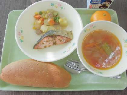 パン・鮭のレモン風味・ピッティパンナ・豆のスープ・果物・牛乳