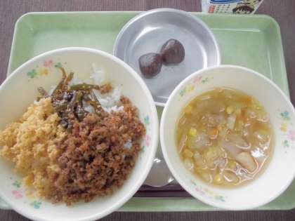 三色丼・白菜スープ・ピリ辛こんにゃく・牛乳