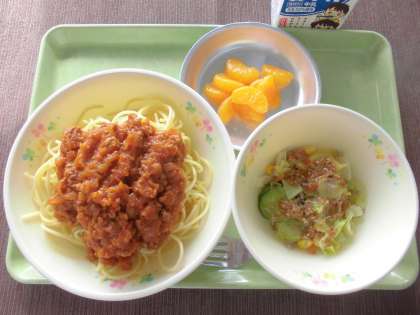 スパゲティミートソース・野菜とじゃこのサラダ・みかん缶・牛乳