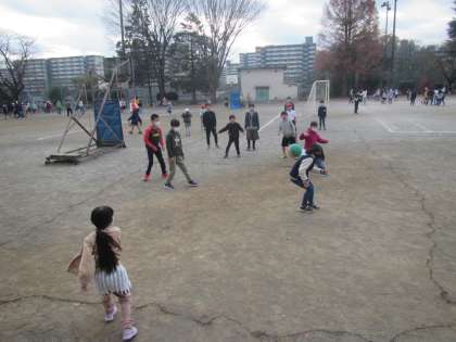 たてわり班ごとに校庭で、決めてあった遊びで楽しみました。
