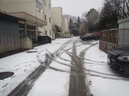 下:駐車場は校舎の日陰なので地熱があまりなく結構積もっていました。