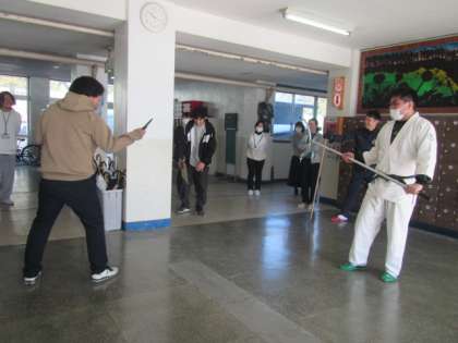 写真・下:三浦先生に犯人役をしてもらい、実際の対応を警察の方に教わる場面もありました。