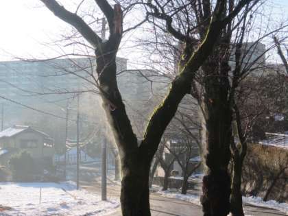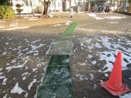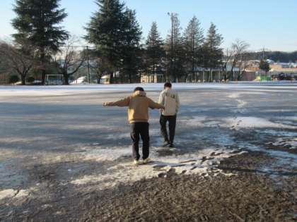 写真上・前日の雪が解けて凍っている場所が校庭にありスケートリンクのようでした。