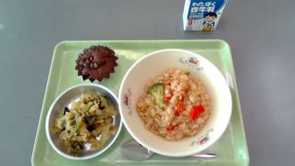 本日は、バレンタインの献立になります。ミニチョコケーキを提供します。ミニチョコケーキは卵を使わずに作っています。