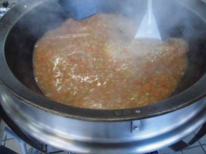写真は、野菜リゾットを作っている写真になります。スープに米を入れて混ぜて加熱している段階の写真です。