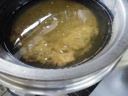 写真はスープのだしをけずり節でとっている場面になります。だしは毎日けずり節から煮出してとっています。けずり節だけでなく昆布や煮干しでもだしをとります。