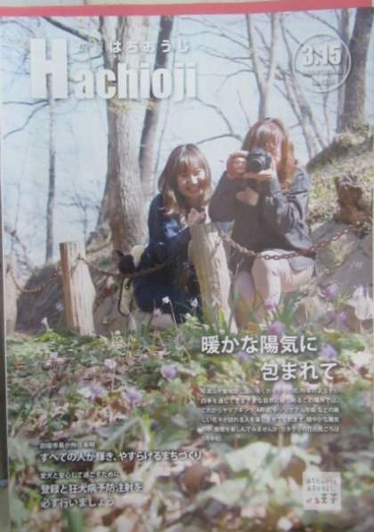 広報八王子の3月15日号の表紙は、カタクリの花(昨年のもの、片倉城址公園にて)を愛でる写真が飾りました。