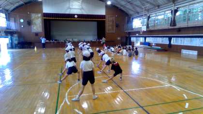 体育館では2年1組と5年1組でシャトルランの練習をしました。終始5年生が、2年生を褒めたり応援したりしていました。