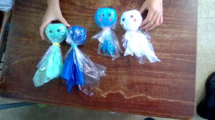1年生がてるてる坊主を作りました。梅雨のシーズンですが、子どもたちは校庭で遊ぶのが大好き。雨が降らないように願いながら作りました。