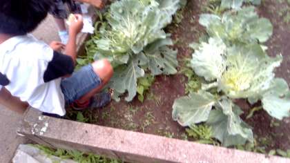 3年生です。花壇にあるキャベツにいるモンシロチョウの卵を採取しています。教室の中で育てるのですが、どのように育つのかわくわくしています。