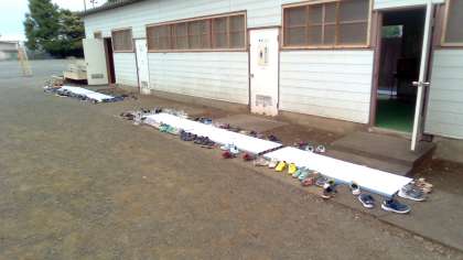 そして、4年生小さな小屋の外に外履きが置いてあります。そうです。やっとプールに入れました。てるてる坊主の効果が明日からも続くといいですね。