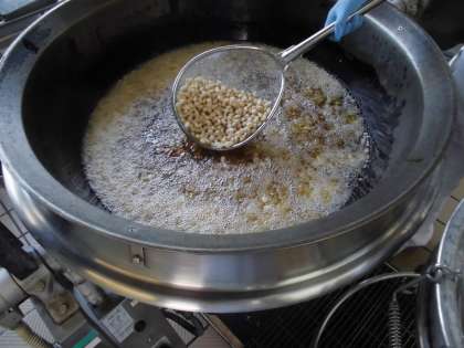 2枚目の写真は、大豆の揚げ煮の調理場面になります。大豆に片栗粉をつけて、油で揚げています。そのあと、しょうゆなどで作ったたれと合わせて煮ます。