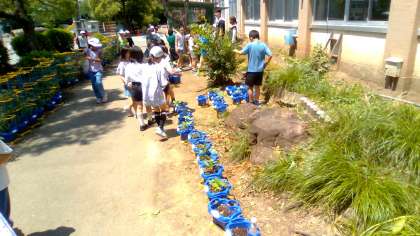 3年生はマリーゴールドやホウセンカ等、自分で種を選んで植物を育てています。天気はよいのですが、日陰になってしまうため、自分たちで移動させました。