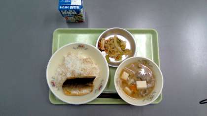 野菜のおひたしには、キャベツ・小松菜・にんじん・油揚げが入っています。小松菜は八王子市で採れた野菜を使用しています。