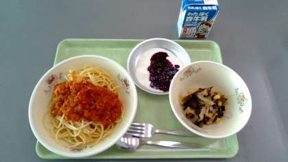 本日は恩方でとれたブルーベリーを使った献立になります。ブルーベリーと砂糖・レモン汁を煮詰めてソースを作りました。ヨーグルトにかけて食べます。