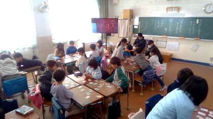 2年生では、かるた取りをしています。いろいろな言葉を覚えながら楽しんで取り組めていました。
