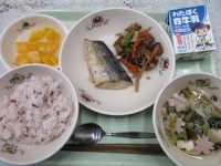今日の給食の献立は、・わかめご飯・いかのねぎ塩焼き・じゃこサラダ・肉じゃが・牛乳...