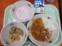 今日の給食の献立は、・ポークカレーライス・ツナと大根のサラダ・ヨーグルトのいちご...