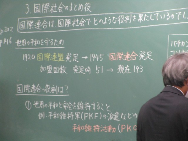 本時の目標は「国際連合は、国際社会でどのような役割を果たしているか理解する」です。現在、加盟国数が193か国になっている国際連合の役割を学びました。国際社会がどのように成り立っているかを理解することは、今日のグローバル社会を生きていくために重要です。生徒は主体的に学習に取り組んでいました。